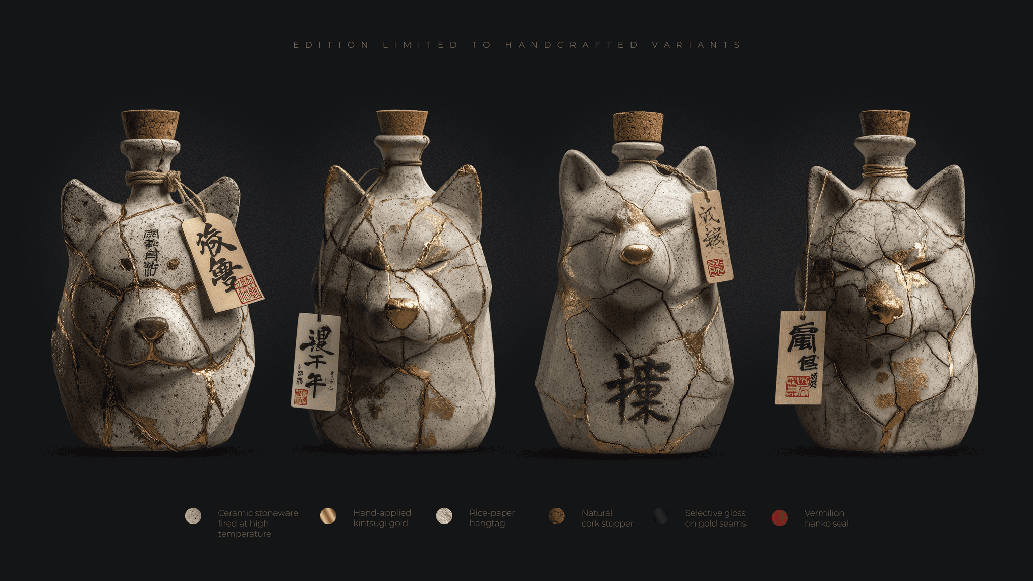 The collection follows the rhythm of ceremonial objects. The form remains humble, but carries a quiet dignity. Gold seams trace the journey of the vessel, and within their branches, the Akita appears as if found rather than placed - loyal, alert, shaped from absence as much as form. Each bottle becomes its own small universe: imperfect, singular, whole.