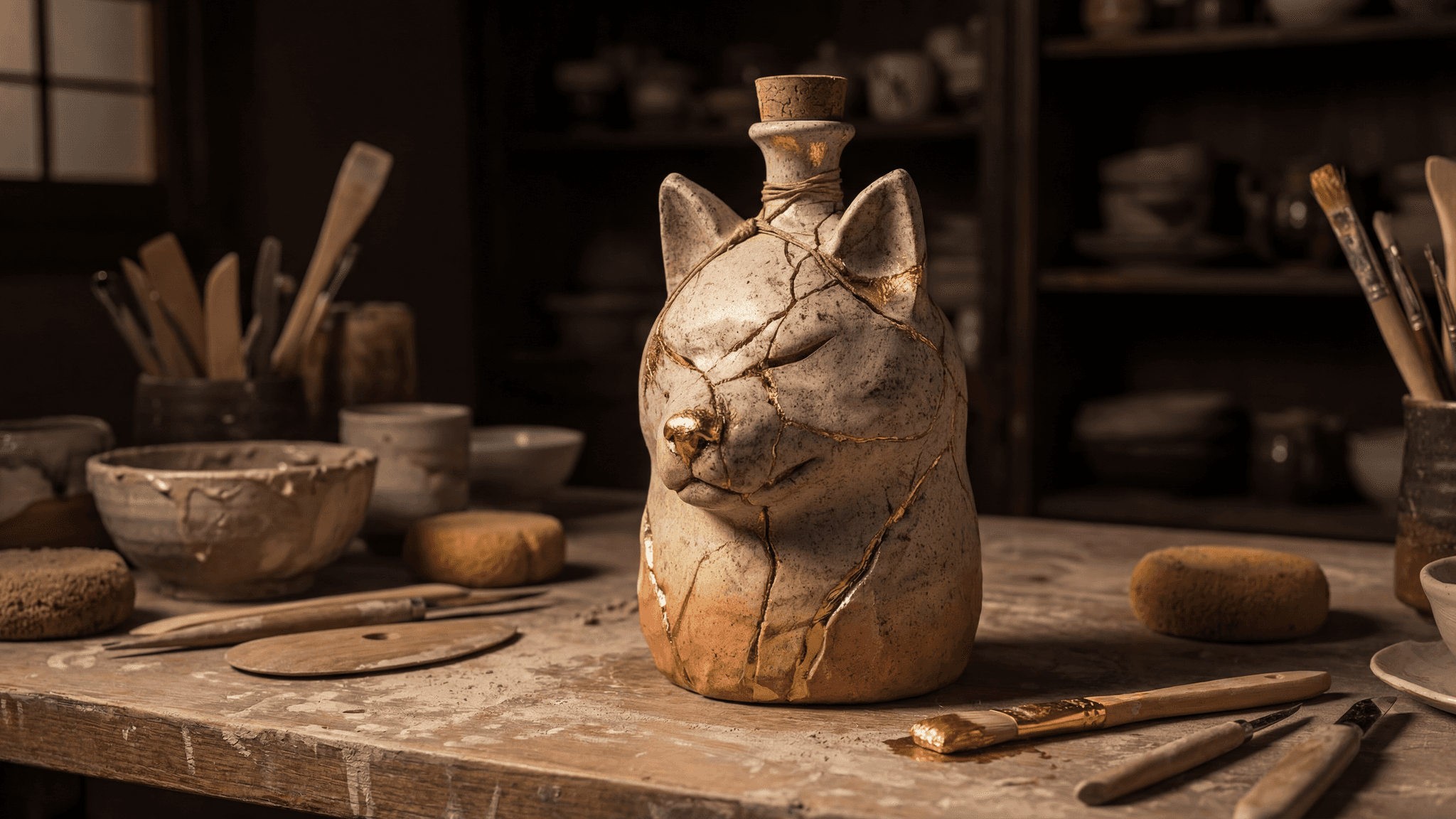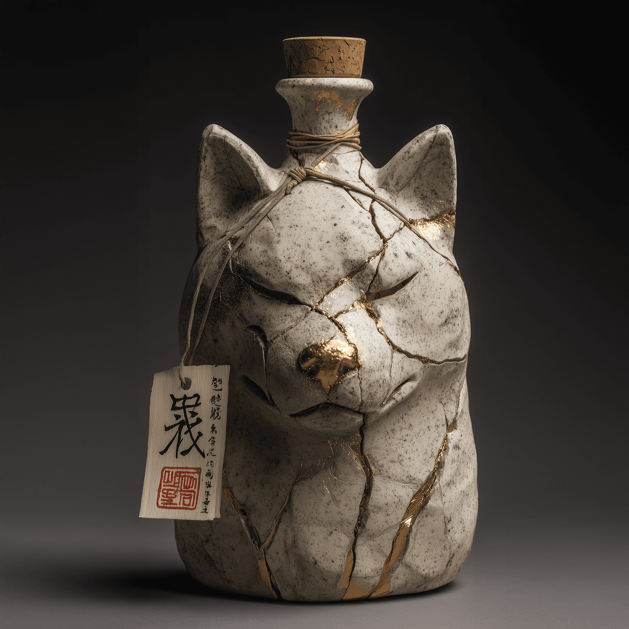 Spirit Animal is a sake shaped by the philosophy of repair. Each ceramic bottle carries golden fractures that reveal the quiet outline of a guardian - an Akita spirit watching over the vessel like a companion on the path back to oneself. No two bottles are alike; each holds its own story of breaking and becoming.
